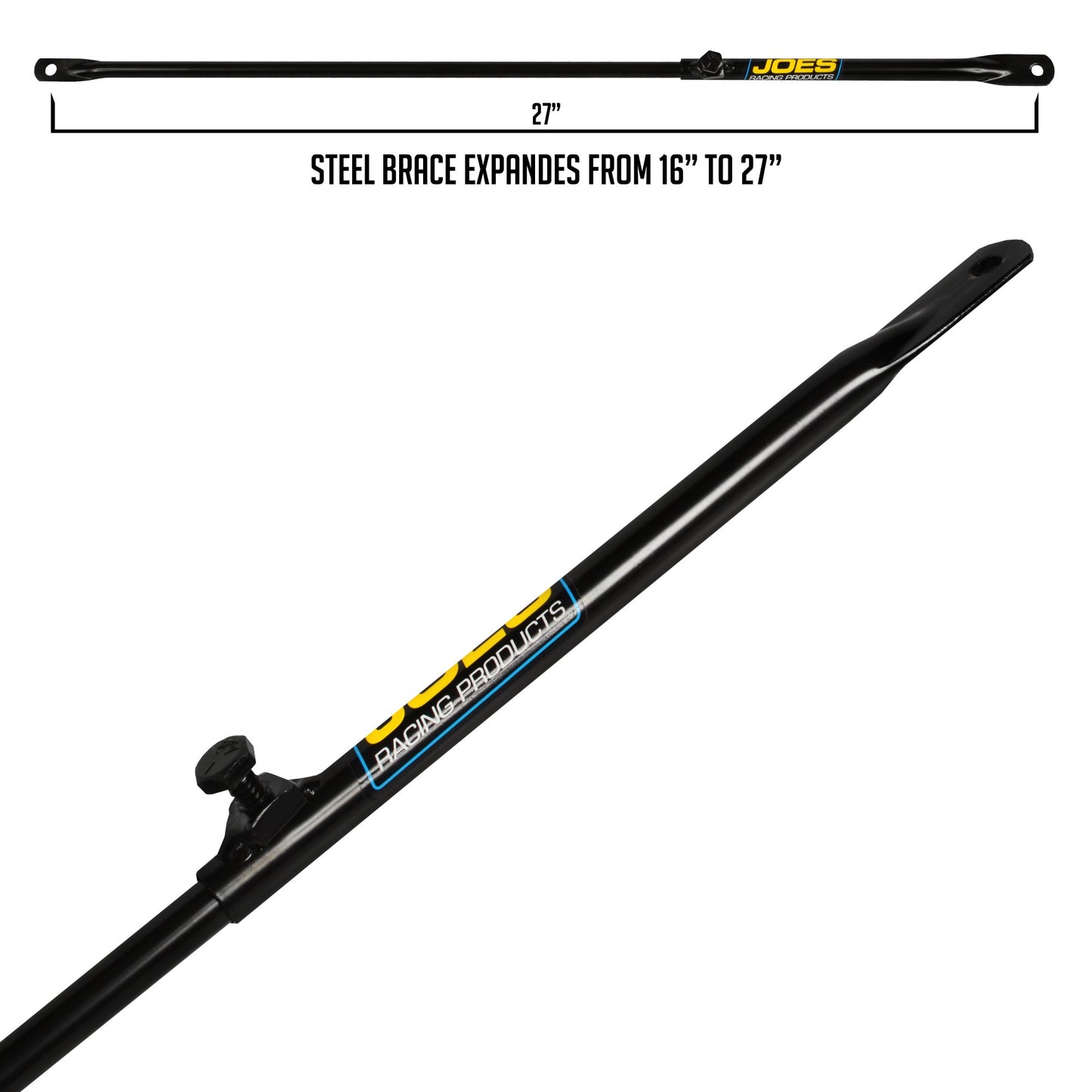 The JOES Economy Body Brace is designed to provide a lightweight, adjustable solution for securely mounting the body on late model and stock cars. This aluminum brace set offers a significant weight reduction compared to traditional steel braces, making it a cost-effective choice for teams looking to optimize their vehicle's performance without compromising on adjustability or durability.
