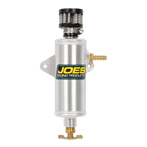 JOES Kart Vent Tank has a panel mount for quick and easy mounting on your kart. The compact tank includes a hose barb fitting and has a drain valve for removal of fluids.