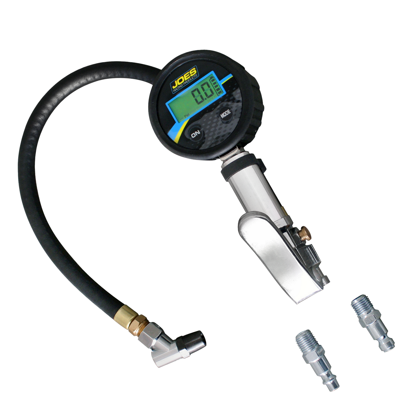 JOES Tire Inflator Quick Fill Valve with a 150 PSI 1% Digital Pressure Gauge is built with a quick fill valve that inflates tires fast. The digital gauge head has a backlight, battery meter on the face and large numbers. 1% accuracy and ¹/₁₀th pound resolution give you the precision you need for optimal tire pressure. At JOES, we make sure you have everything you need so we factory install a Chrome Angle Chuck & supply you a Ball Chuck for tight spots. We also give you the 2 popular size fittings to connect to your air hose allowing you to use the JOES Gauge right out of the package without running to the hardware store.