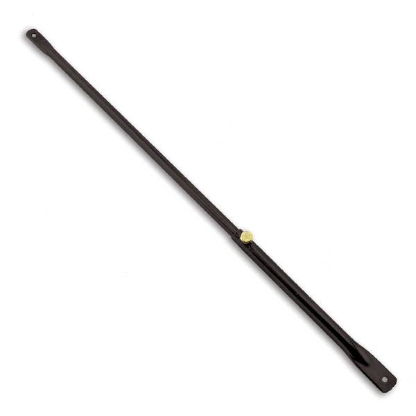 Aluminum, black powder coated. Weighs just 2.5oz. Pre-Drilled 1/4" Holes on both ends. Extends from 10" to 26", you must cut the tube to go shorter than 21".